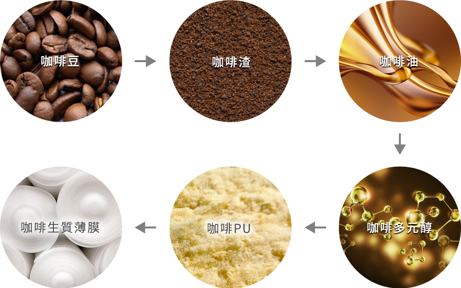 台灣本地紡織廠歷經四年的研發,將具有除臭效果的咖啡渣加至布料纖維中,藉由萃取回收咖啡渣中萃取的咖啡油複合材料,創新開發出能有效減少 25% 以上資源,且榮獲 2015 ISPO AWARD-SELECTION 大獎及美國 USDA 生質產品認證標章的地球上第一個環保咖啡生質薄膜,也能用來做為替代石油製造的薄膜材料,秉持著將「垃圾變黃金」的思維,重新創造物件價值,並賦予新生命。