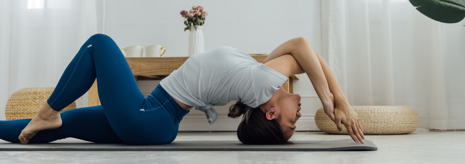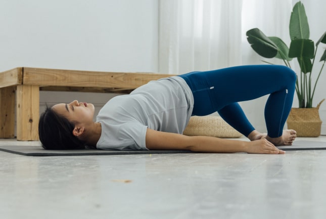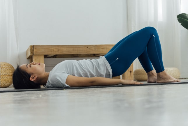 Step 1:平躺於地面,膝蓋彎曲,雙腳貼地,保持髖骨和膝蓋保持平行。