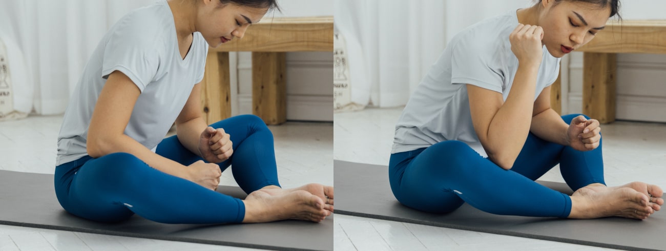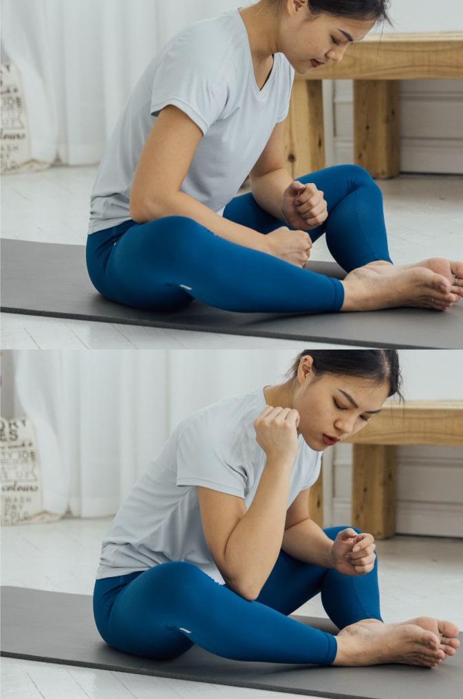 Step 2:接著,利用手肘的力量按壓大腿和小腿內側。