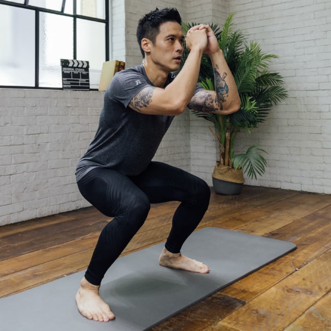 step 2:重心置於整個腳底板,臀部像坐椅子一樣往下坐,如同深蹲姿勢。