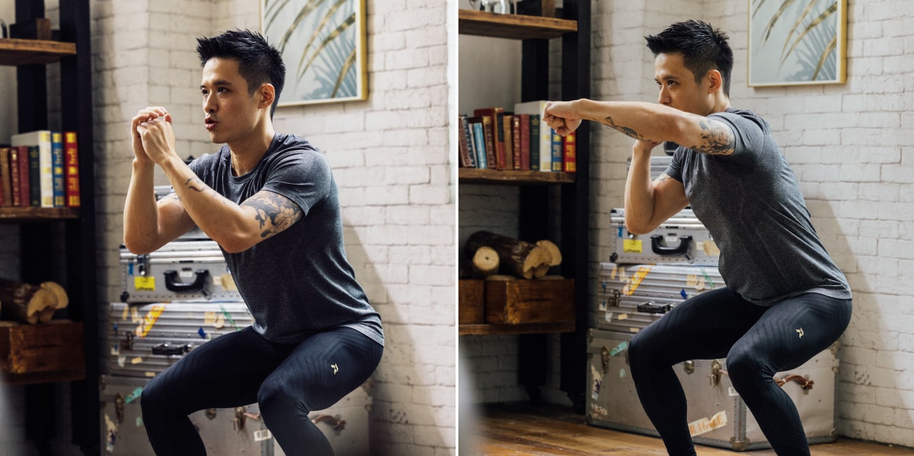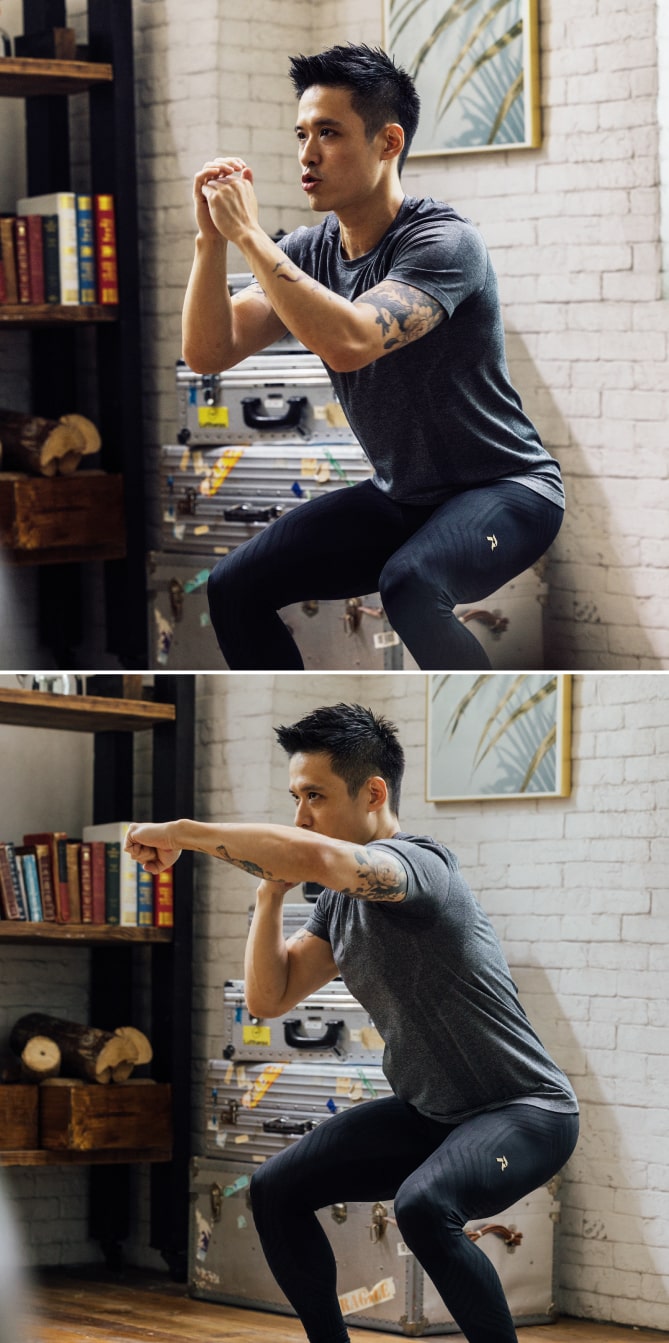 step 4:保持身體穩定,向下深蹲,左手勾拳、右手勾拳。