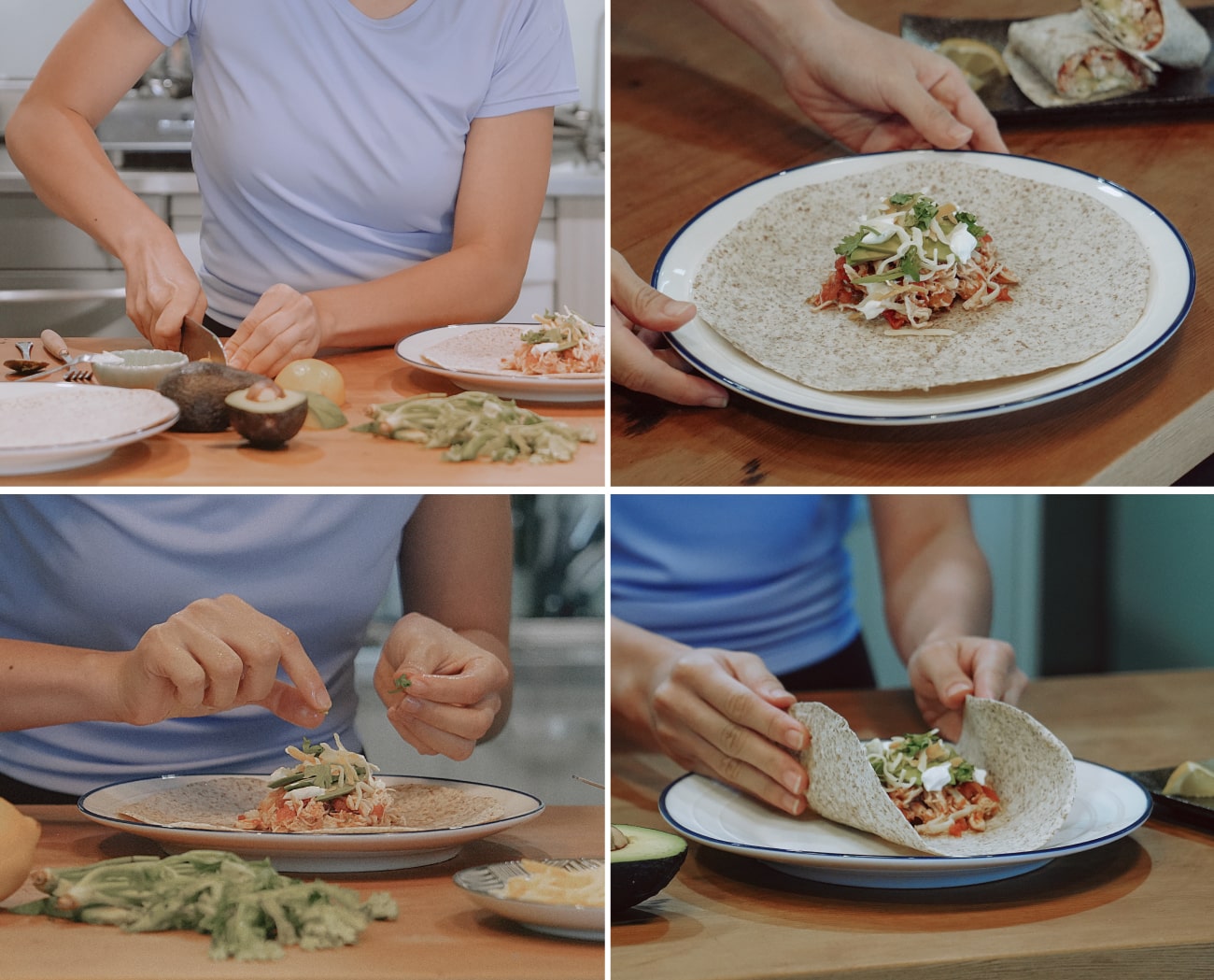 ② 將混合好的雞絲擺放在墨西哥捲餅皮上。