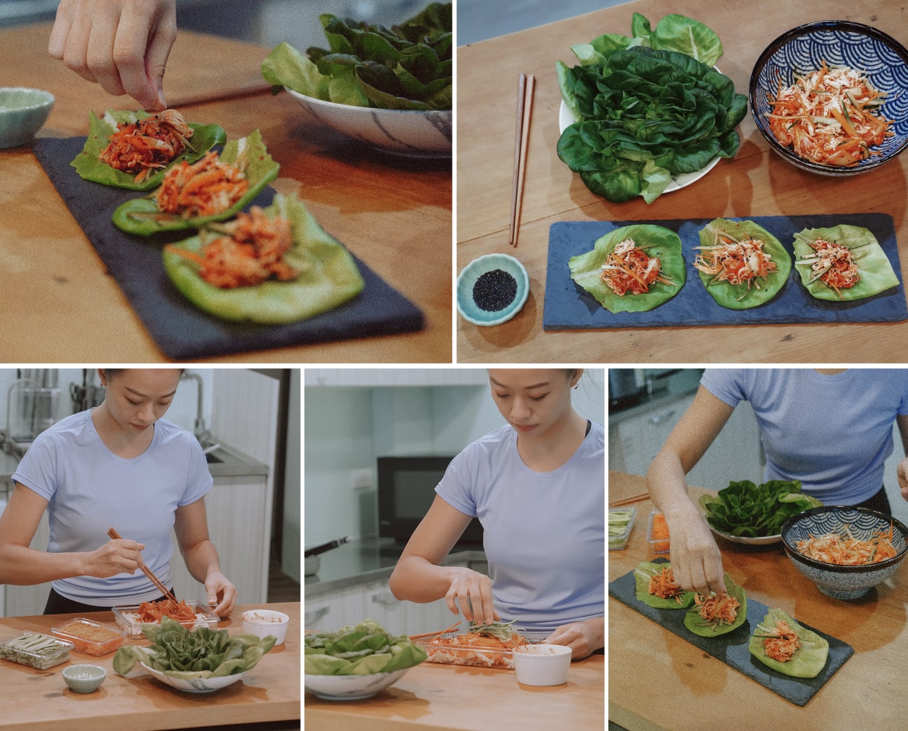 〈 食材 〉雞絲、小黃瓜絲、紅蘿蔔絲、泡菜、芝麻、奶油生菜