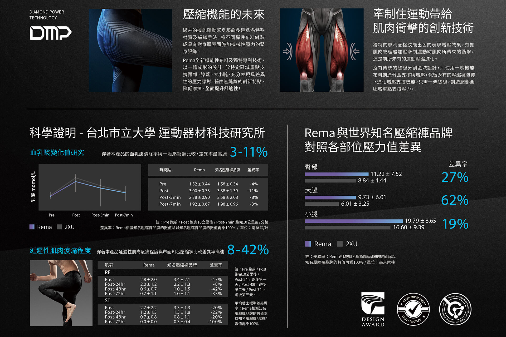 - 獨特的專利技術:Rema獨創的專利設計技術,使得DMP 2.0 在保持壓力均勻的同時,具有絕佳的伸縮性和貼合度。這種技術意味著穿著者可以在極致的舒適中體驗卓越的壓縮。